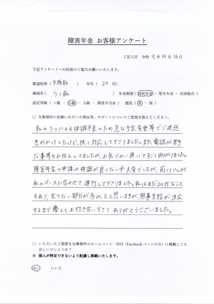 障害年金の申請は体調が良くない中、大変でしたが、前川さんが私のペースに合わせて進行して下さりました。私はまだ20代なこともあり、至らない部分が多かったと思いますが、無事支給が決定するまで優しくお付き合い下さりありがとうございました。