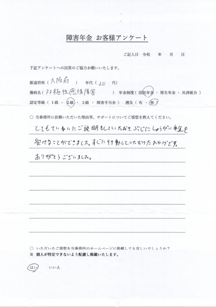 <新規裁定請求>都道府県:大阪府 年代:20代双極性感情障害 障害基礎年金2級 とても丁寧に説明もしていただき、無事に障害年金を受けることができました。すぐに行動していただけたおかげです。ありがとうございました。